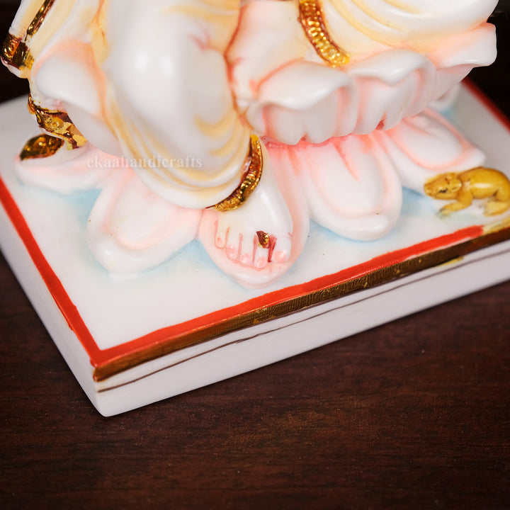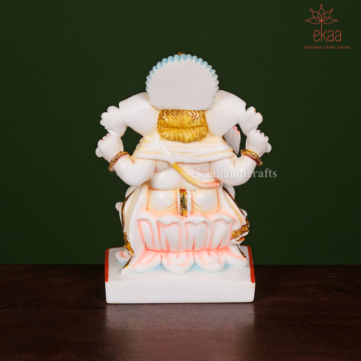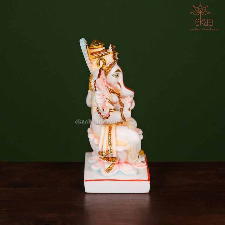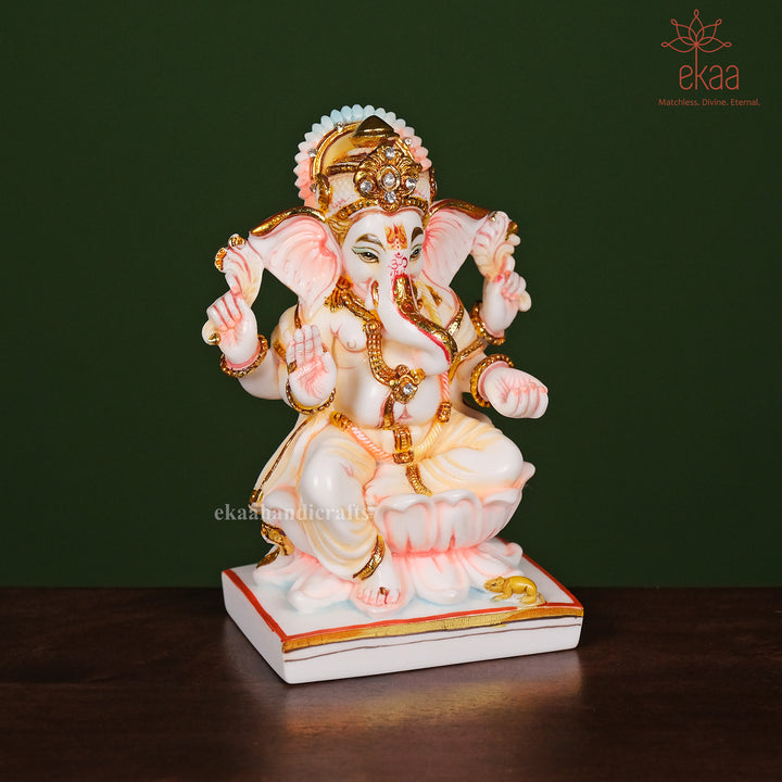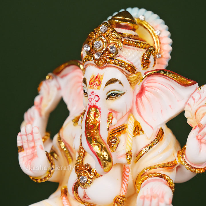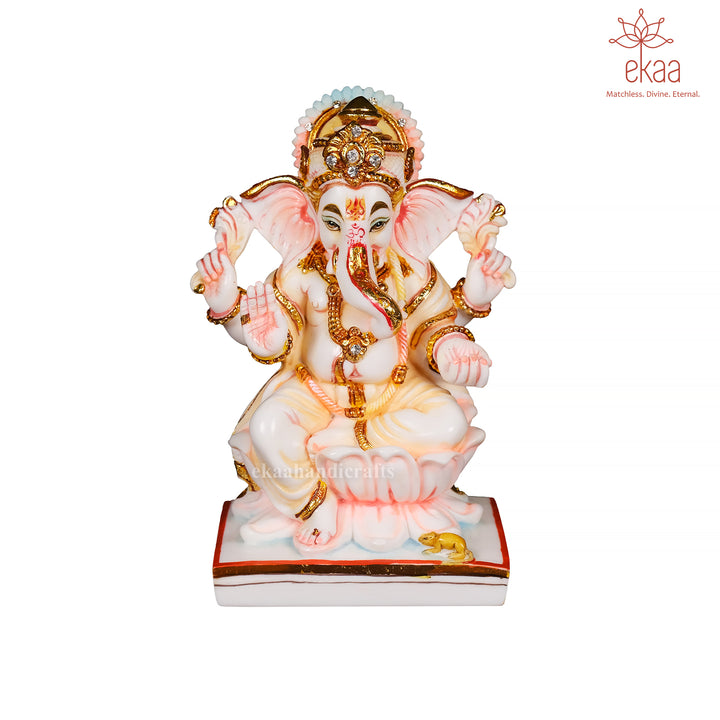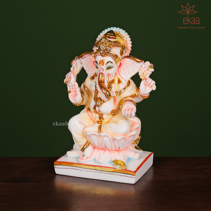 This radiant Ganesha idol exudes peace and prosperity with its soft white marble finish, golden embellishments, and delicate pink hues. Adorned with embedded stones and intricate details from crown to base, every feature reflects devotion and artistry. Lord Ganesha is seated gracefully on a lotus, blessing your space with wisdom, grace, and good fortune. Handcrafted by the artisans of Ekaa Handicrafts, this divine murti is perfect for home altars, festive decor, or as a sacred gift. Order yours today and enjoy centuries of tradition at your fingertips!