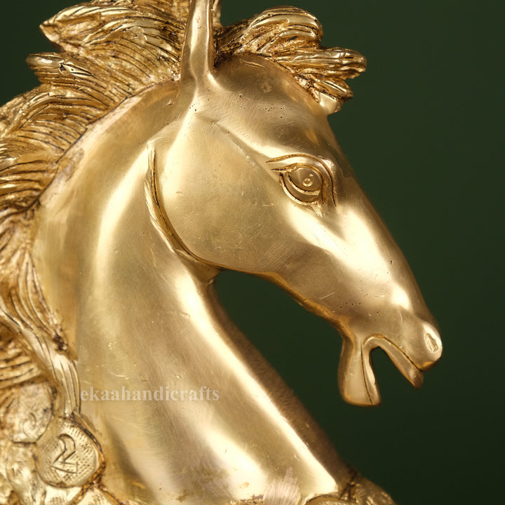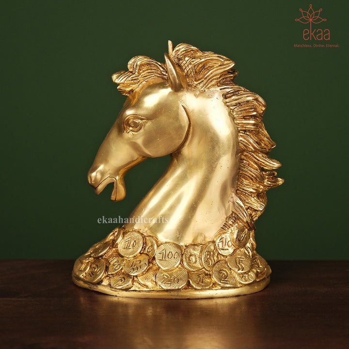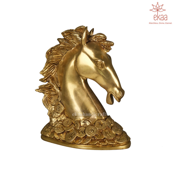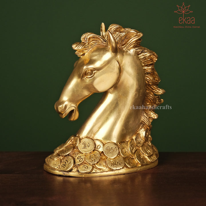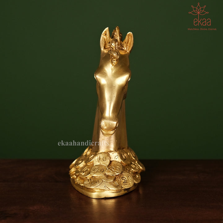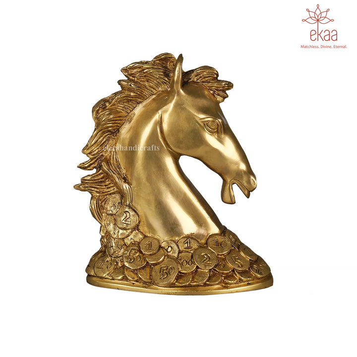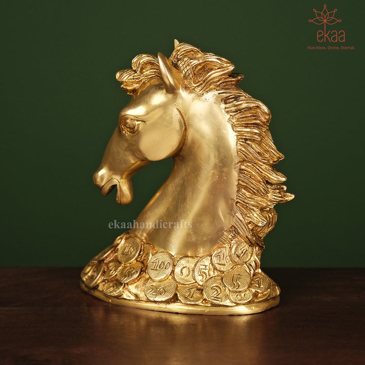 Invite speed, success, and prosperity into your home or office with this striking brass horse statue, standing proudly atop a bed of coins. In Feng Shui and Vastu traditions, the horse symbolizes strength, ambition, and upward momentum, while the coins stand for wealth and sustained abundance.