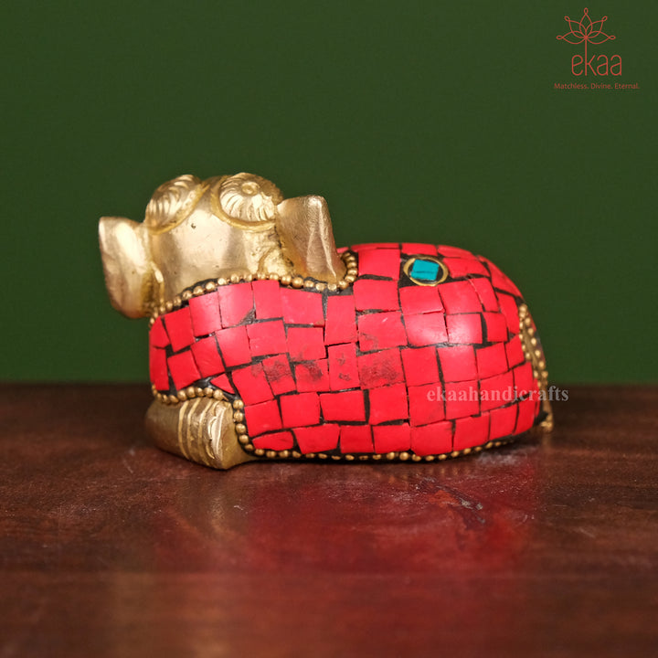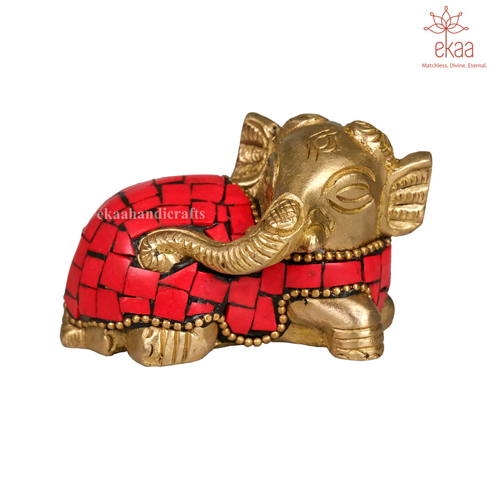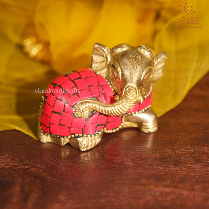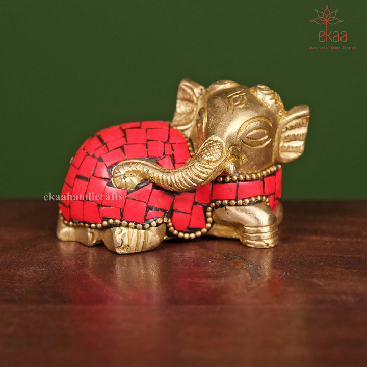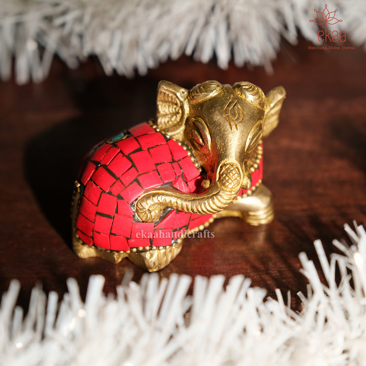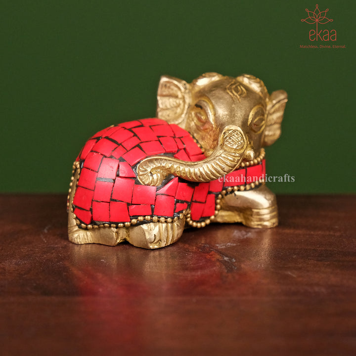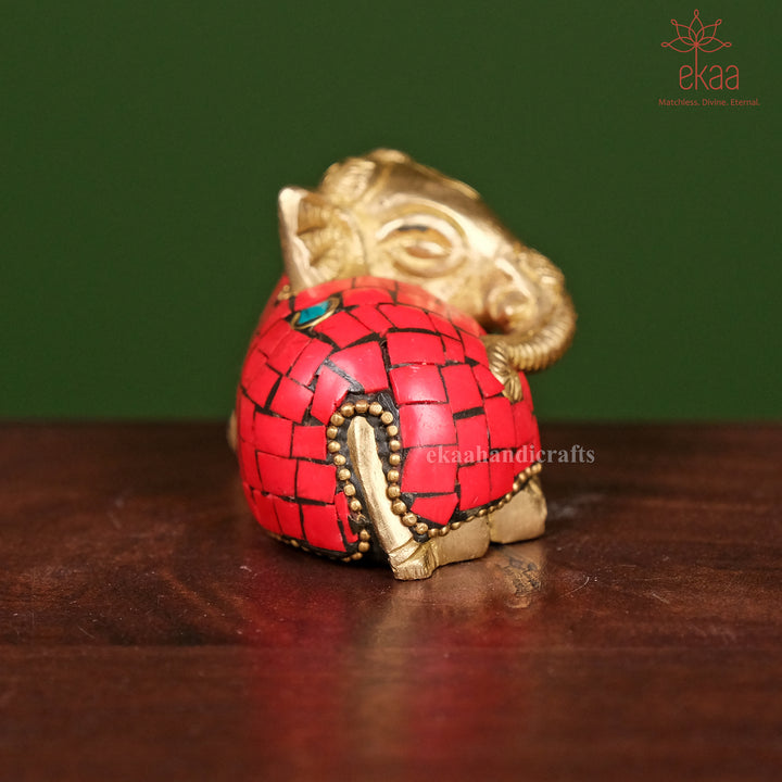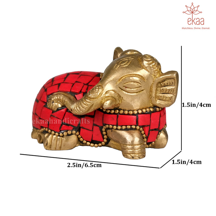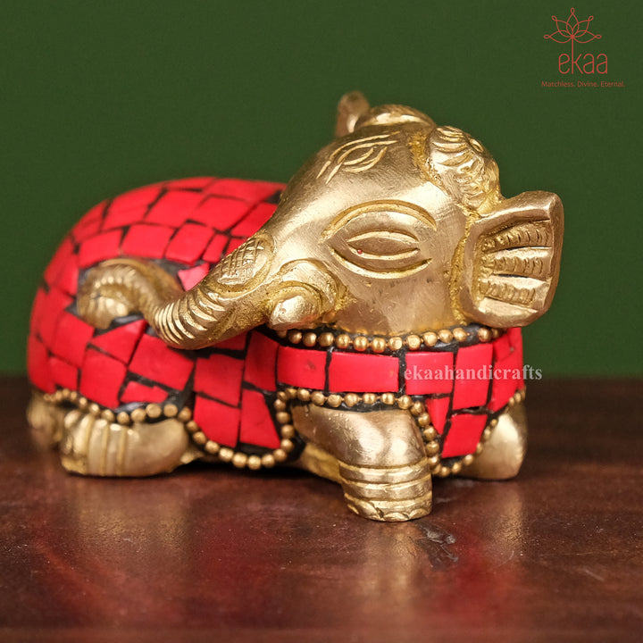 Graceful and serene, this brass elephant statue features a resting posture adorned with vibrant red mosaic inlay. A symbol of wisdom, strength, and calm energy, it makes a perfect accent piece for your living room, study, or entryway. Handcrafted by skilled artisans, its intricate detailing and bright stonework reflect India’s timeless artistry. A thoughtful gift and a charming addition to any decor.