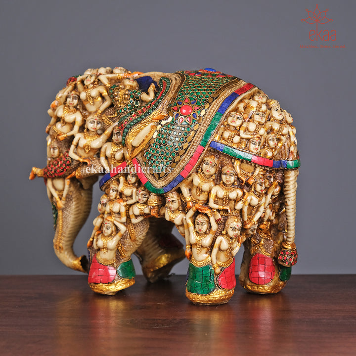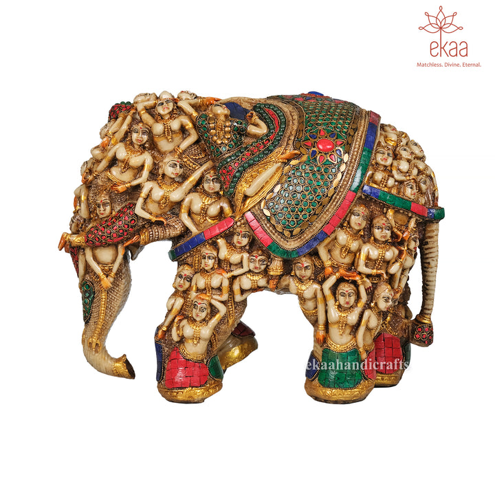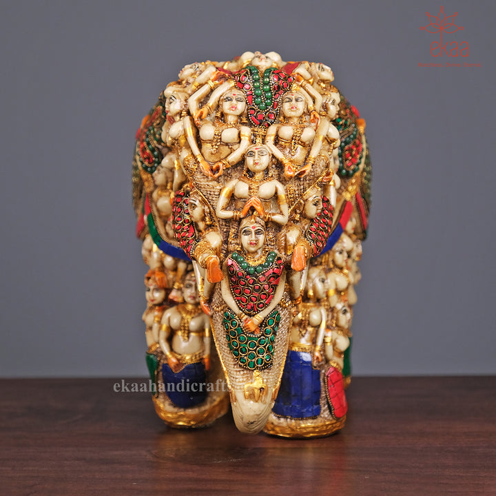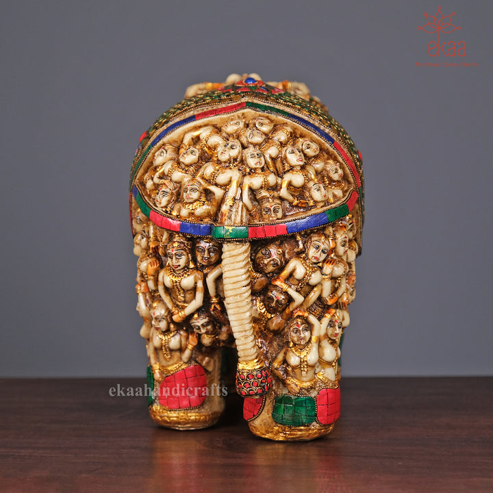 An elephant unlike any other, this masterpiece is sculpted entirely from a mosaic of tiny human forms—each hand-painted and adorned in rich colors, jewels, and gold accents. Symbolizing strength through unity and the spirit of collective power, this sculpture is both conversation-starter and cultural treasure. Painstakingly detailed by the artisans of Ekaa Handicrafts, it blends folk art, mythology, and imagination into a single, breathtaking form. Ideal for statement decor, gifting, or curated collections.